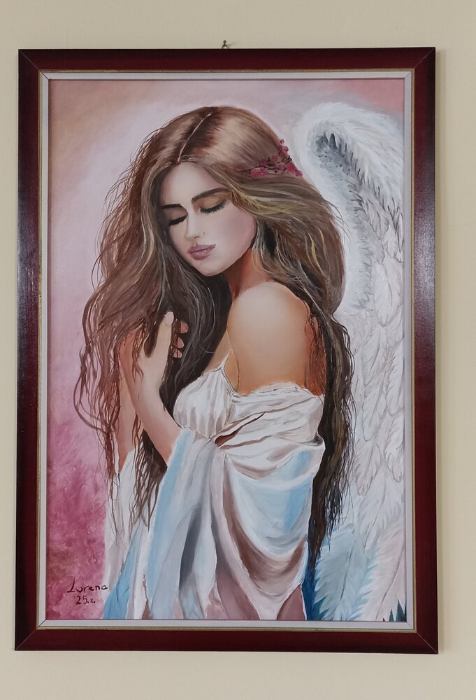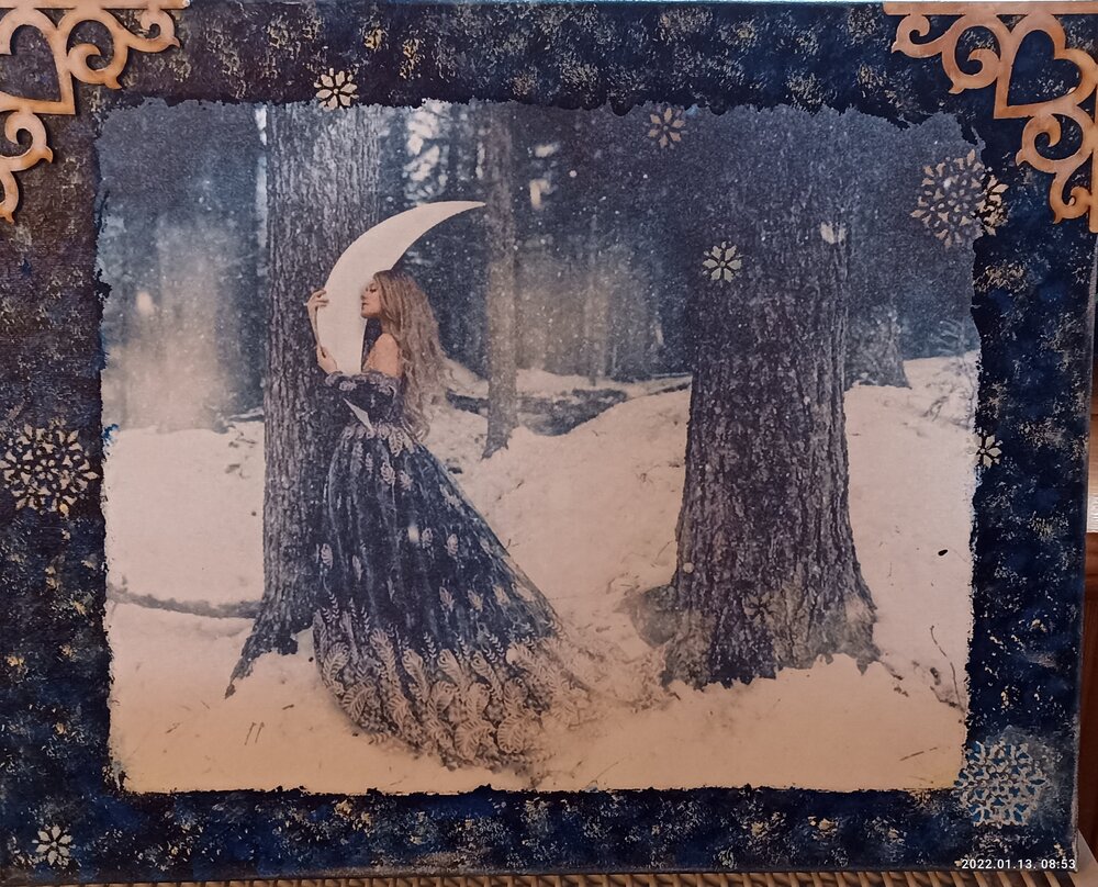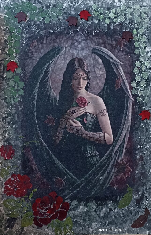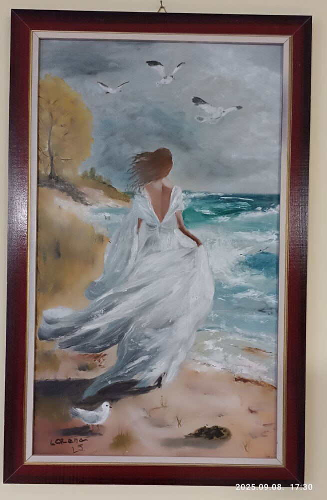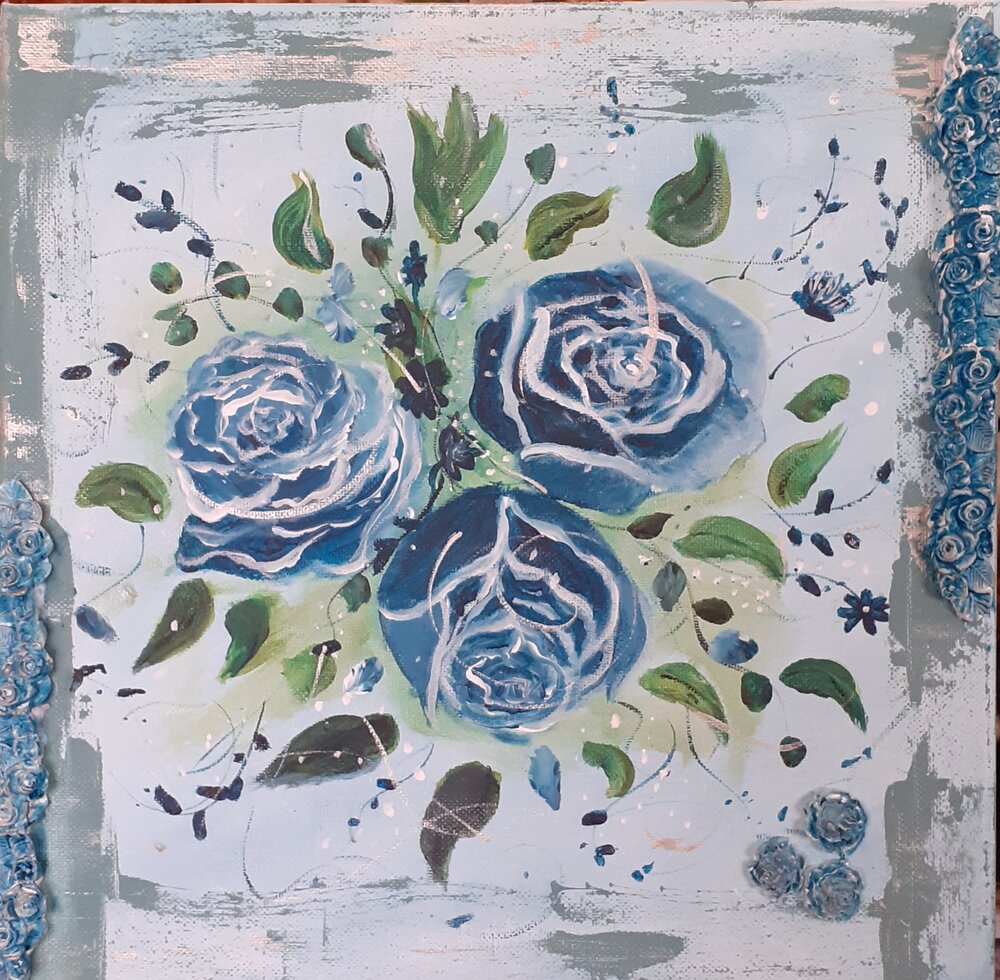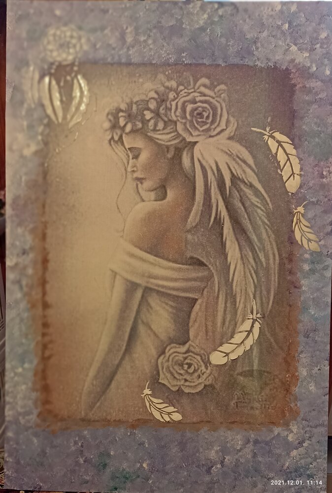 Pont erről nem hittem volna,hogy azonnal elkel, de egy hölgy beleszeretett,ahogy meglátta és azonnal el is vitte. A szélén lévő rózsákk gipszből készültek, azt a hatást keltve, mintha nagyon-nagyon régi lenne és letöredezett volna már a keret is. Igen csak hatásos technika.