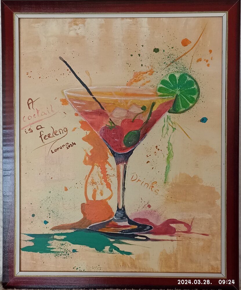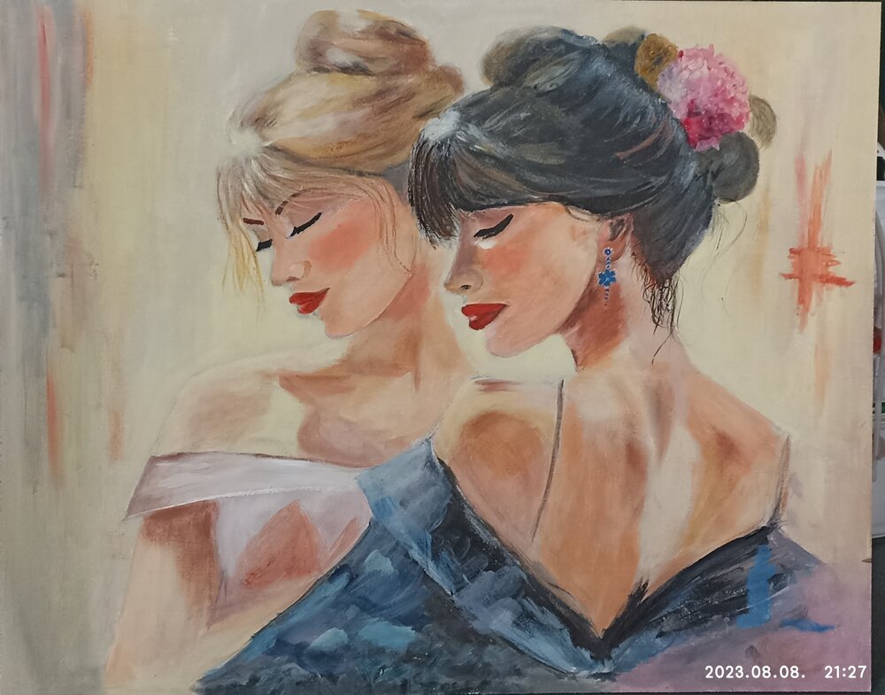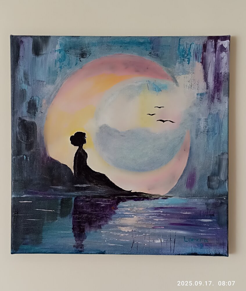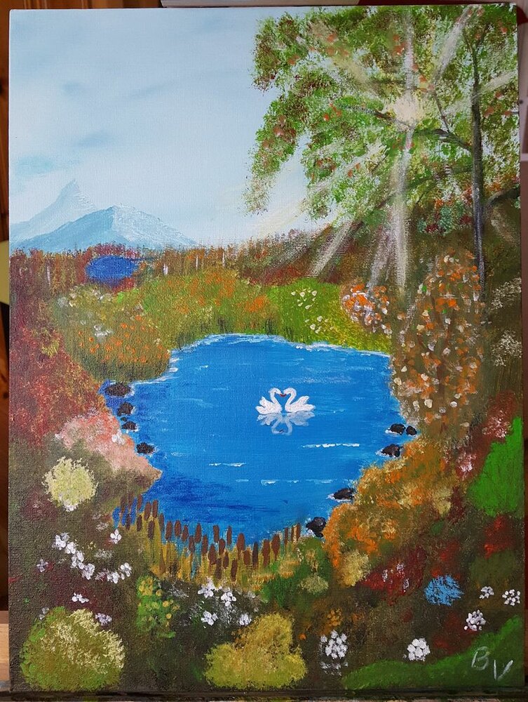Közösen kiválasztott kép, festőtáborban festettük a lányokkal. Mindenki belevitte a saját stílusát, neten találtuk a képet, kicsit sem hasonlít. :) Mindenki saját címet adott neki.
